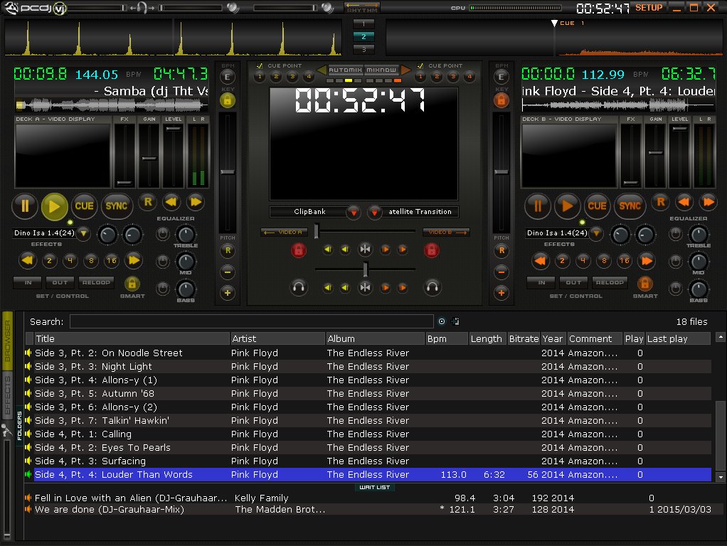 Seit 2008 nutze ich das Programm PCDJ-VJ Dieses Programm erlaubt tolles arbeiten mit der Möglichkeit, auch eine Video-Discothek mit entsprechendem Material über Leinwände bzw TV zu fahren. |